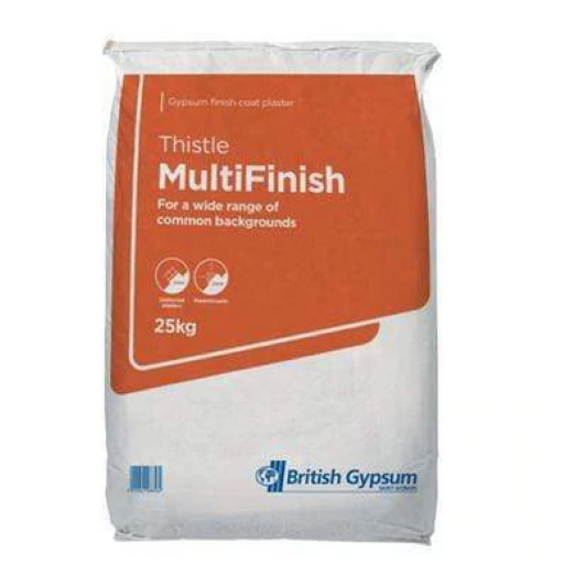 British Gypsum’s Thistle Multi-Finish Plaster is a high-quality premixed gypsum plaster available in 25kg bags. Finishing plaster is a retarded hemihydrate plaster which requires only the addition of clean water to create a long workability mortar making it easy to work with both for beginners and seasoned contractors. Thistle Multi-Finish was made with decoration, tiling, maintenance, and plastering undercoat plasters in mind.