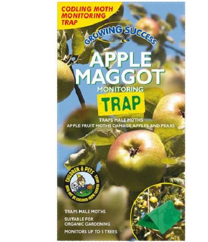 The main cause of maggot damage in apples and pears is due to caterpillars produced by the codling moth. In winter female moths lay eggs in trees. The eggs hatch out into caterpillars which feed on fruit in early summer. The monitoring trap allows gardeners to assess the infestation problem and treat with a suitable insecticide if necessary.