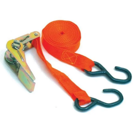 15ft x 1" ratchet tie down with double vinyl coated steel. "S" hooks which provide a secure hold without scratching. Trouble free push button quick release.