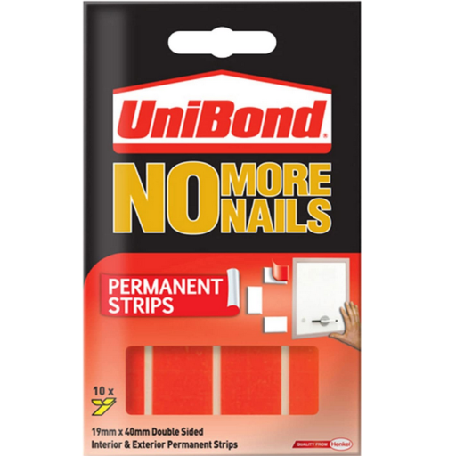 - Package Contents – Unibond No More Nails Permanent Strips, strong double sided tape for mounting jobs inside & outside the home, for most materials*, holds up to 3kg, waterproof, white, Pack of 10