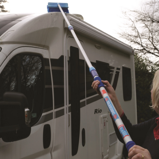 Water fed quality cleaning brush extends to 3m. Comes with 2 interchangeable heads, a wide angle soft brush and sponge/ squeegee. Perfect for cleaning in hard to reach places at home or on a vehicle. Strong, lightweight aluminium handle extends to 3m. Soft cushioned grips add extra comfort and also insulate from the cold water running through the handle. Convenient water on/off switch with soft feathered bristle tips to ensure cleaning on all surfaces. Length without extension is 1.3m.