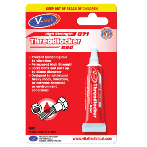 VT-871 is a red color, all purpose, permanent high strength threadlocker formulated for locking and sealing of threaded fasteners which require normal disassembly with standard hand tools. it cures when confined in the absence of air between close fitting metal surfaces. It locks bolts and nuts up to 25mm diameter, preventing loosening due to vibration, and sealing against leakage and corrosion. It is designed to withstand heavy shock, vibration, or extreme chemical or environment conditions. Features:-