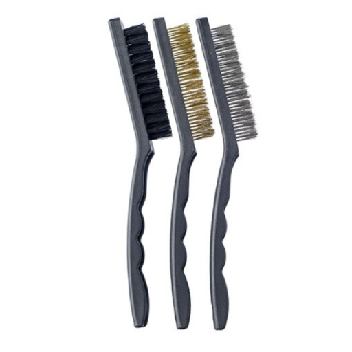 Brass brush for use on light metal, engine spark plugs and battery cleaning.