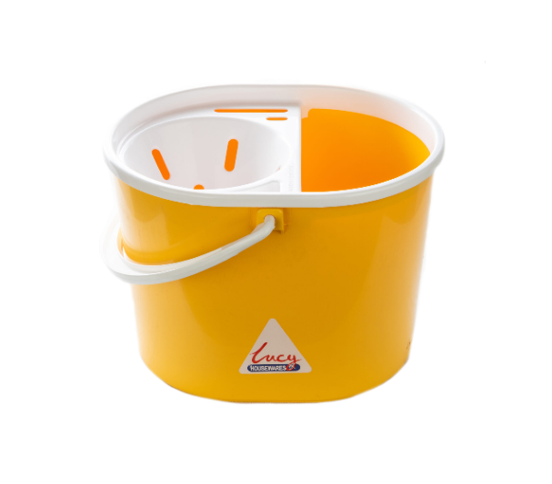 Extra tough mop bucket with easy clip on/off sieve, durable carry handle.