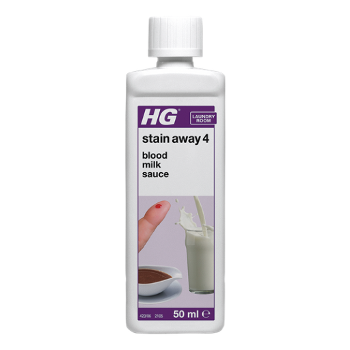HG stain away no. 4 removes stains caused by sauce, gravy, herbs, blood, milk and egg whites, but also chocolate, mayonnaise, whipping cream and exudate. HG stain away no. 4 is one of our 7 special HG stain removal products.