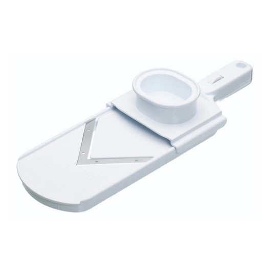 Vegetable and fruit slicer with a height adjustable stainless steel 'V' shaped blade and safe to use, easy slide action safety holder / pusher. The safety holder / pusher protects fingers and includes a food gripper so food can be sliced right to the very end. Designed to rest on bowl rims for slicing directly into bowls and pans.