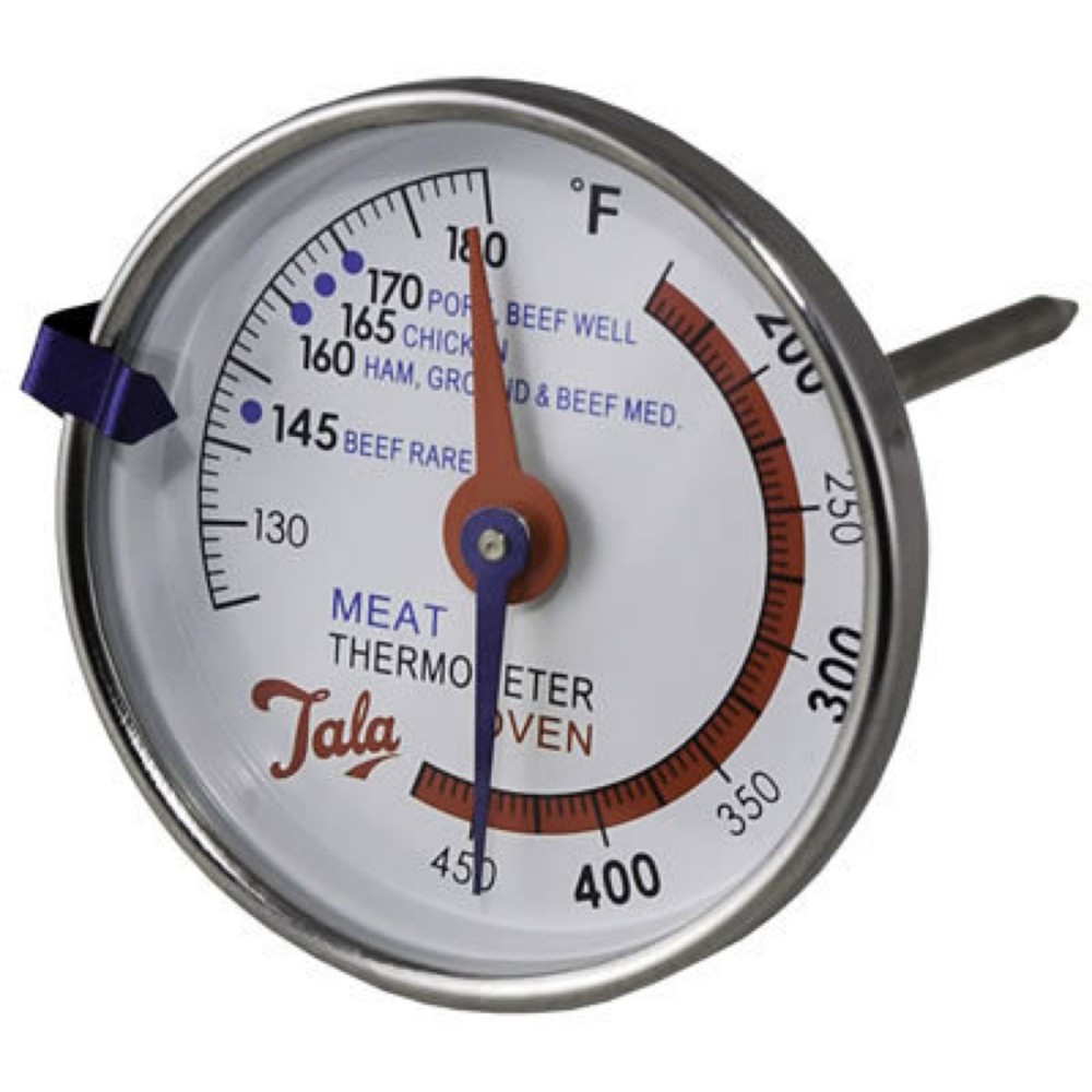 A Stainless steel, meat and oven thermometer with easy read pointers as well as separate meat and oven scales. The oven and meat thermometer has two pointers-blue and red. The blue pointer indicates internal meat temperatures on the black scale with blue dots. The red pointer indicates oven temperatures on the red scale. The two pointers measure separately but simultaneously.