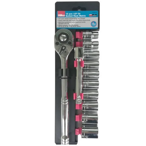 12 piece fully heat treated carbon steel socket set with mirror chrome finish. 1/2” quick release ratchet handle with 72 teeth. Wall drive sockets allow for more torque and avoid damaging the nut. Comes with 150mm extension bar