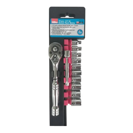Description 12 piece fully heat treated carbon steel socket set with mirror chrome finish. 1/4" quick release ratchet handle with 72 teeth. Wall drive sockets allow for more torque and avoid damaging the nut. Comes with 75mm extension bar and 4, 5, 6, 7, 8, 9, 10, 11, 12, 13mm sockets.